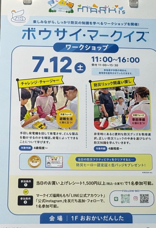 防災イベントは2ヶ月に1回行っていて(奇数月の週末、主に第2土曜日)、次回は9月の予定です(会場は通常はMARK IS 福岡ももち 2階 イベントスペース)。