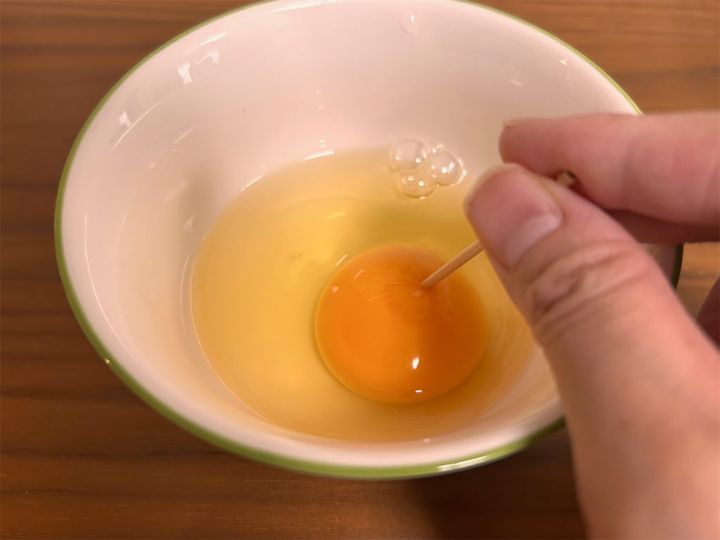 爪楊枝で黄身の表面に2か所ほど穴を開けます。この作業、めっちゃ重要!これは電子レンジで加熱した際に黄身が破裂するのを防ぐため。必ず行ってくださいね。