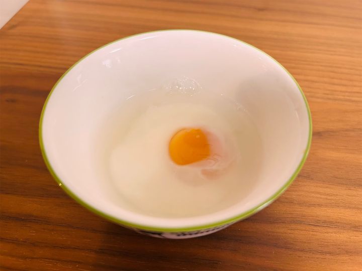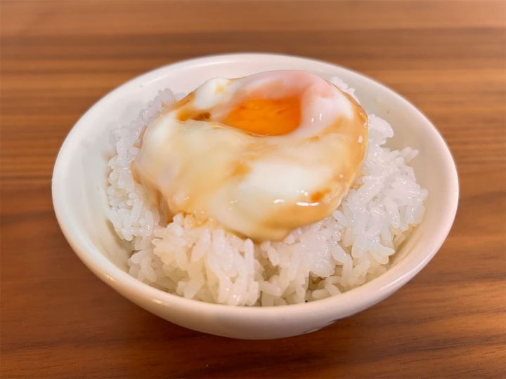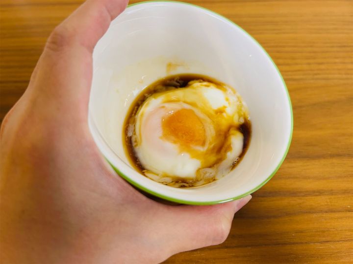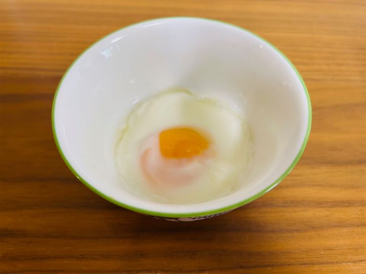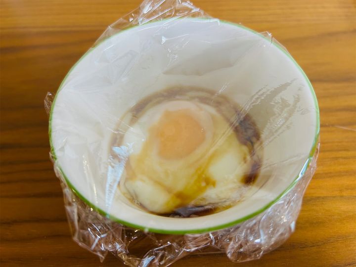 白身はぷるぷるで、まさに温泉卵のような食感。レンジ加熱だからこそ、絶妙な柔らかさを実現できたように思います。