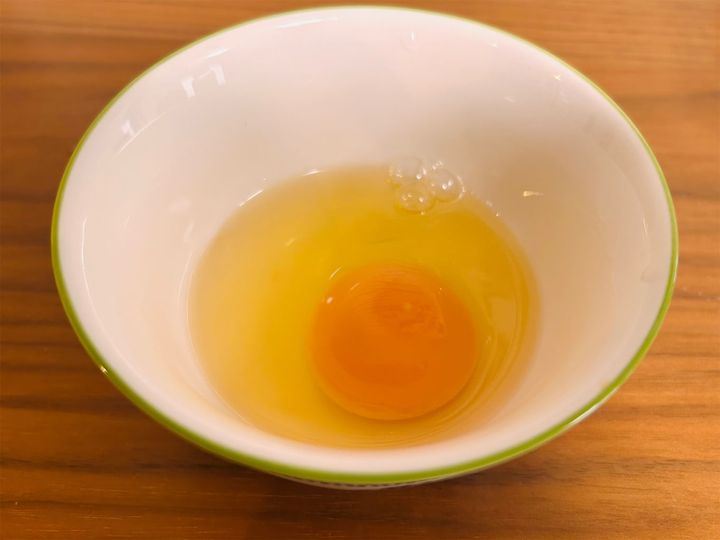 1. 小さめの耐熱容器に、冷蔵庫から出したての卵を割り入れます。
