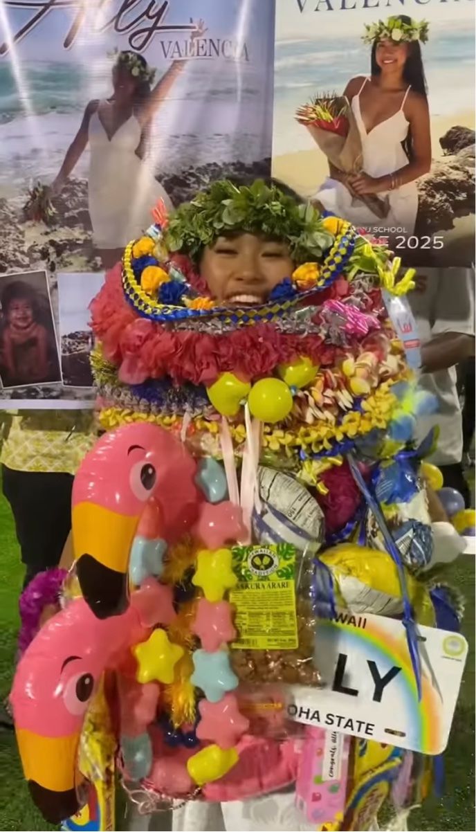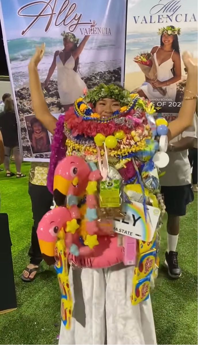 首に何重にも重ねられた大量のレイは、卒業を祝うためのハワイならではの伝統的なアイテム。 そのボリュームは首元だけにとどまらず、上半身全体をすっぽり包み込むほどです。