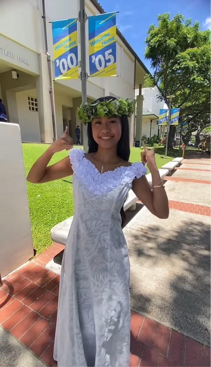 白い花柄のドレスを身にまとったこちらの生徒は、これから卒業式に臨む卒業生。 頭にはグリーンの花冠を飾り、シンプルながらもハワイらしい雰囲気が漂っています。