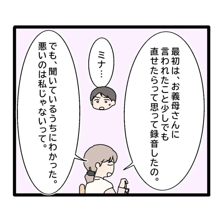 「最初は、お義母さんに言われたこと、少しでも直せたらって思って録音したの。でも、聞いているうちにわかった。悪いのは私じゃないって」そう言って、またお守りの再生ボタンをぽちり。