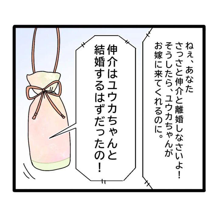 すると、「ねぇ、あなたさっさと伸介と離婚しなさいよ!そうしたら、ユウカちゃんがお嫁に来てくれるのに」「伸介はユウカちゃんと結婚するはずだったの!」と義母の声が。