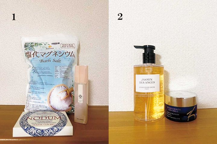 1.「塩化マグネシウムフレークをたっぷり入れて、好みの香りを追い入浴剤。癒されたい時はKITOWAのサンタルがお気に入り。デトックスしたい日はノダムのクレイバスを」