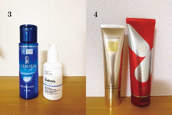 4.「脚や腕はアンジュボーテのボディメイク4DEXで引き締め。バスト&ヒップはピーチ・ジョンのボムバストクリームを」
