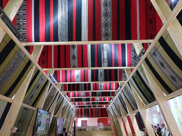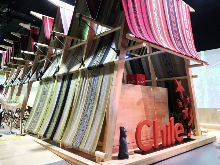 館内で圧巻なのが、中央にどーんと展示されている巨大な手織物「マクン(Makun)」。これはチリの先住民族・マプチェ族の伝統織物で、「マント」や「人を守る布」を意味するもの。なんと今回の万博のために200人の織り手が300日間かけて一針一針、心を込めて織り上げた、まさに“魂の布”です。