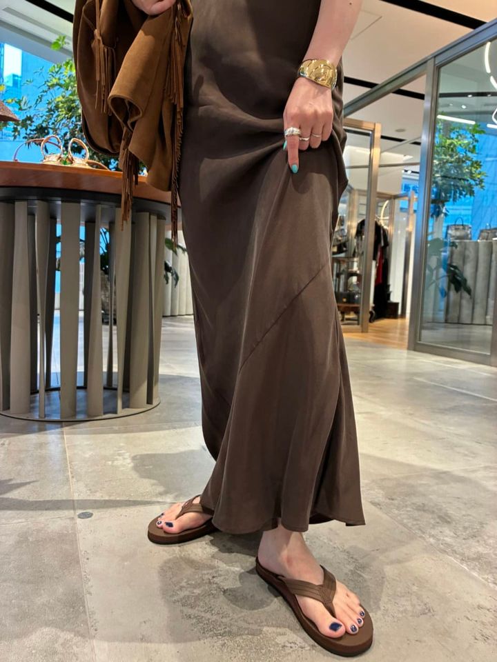 「ワンピースはアパルトモンオリジナルブランドの『Lisière』。ミニマルなデザインでも着る全ての人をキレイに見せてくれるラインや素材選びにこだわったブランドです。こちらのワンピースもまさにその通り! バイアスがほっそりとした形ですが、裾にさりげない切り替えを入れることで上品なフレアになっています」ワンピース¥39,600(リジエール/SELECT by BAYCREW’S)