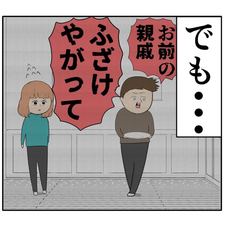 義母の度重なる嫌味や失礼な言葉に耐えられなくなり絶縁も視野に入れて義実家に話し合いに訪れたさくらさんと次郎さん夫婦と、妻モモさんの親戚から失礼なことを言われたと激怒し謝罪させるためにモモさんを連れて義実家を訪れた次郎さんの弟の三郎さん。さくらさんが自分の気持ちをはっきりと義母に伝えると、モモさんも初めて義母に反論。義母に詰め寄られたモモさんが「三郎さんとの離婚を考えています」とみんなの前で切り出すと、この時初めてモモさんの離婚の意思を知った三郎さんは理解が追いつかず固まってしまいます。義母から嫁の愚痴を聞かされ続けて三郎さんが変わってしまったと離婚したい理由を説明するモモさんに、義母は「思った事を言っただけ」と反論し「それで離婚なんて呆れる」とモモさんを批判しました。モモさんも負けずに「お義母さんが私の事をどう思っても自由ですが、それを息子に言う必要はない」と反論すると、さくらさんも「私もそう思います。嫁の悪口を息子に言い続ける事でどうなるか想像力を働かせて欲しい」とモモさんに加勢。嫁たちに責められ義母は怒り心頭。そのとき、ずっと固まっていた三郎さんが「アノサ・・リコンッテナンノコト?」と口を開きました。