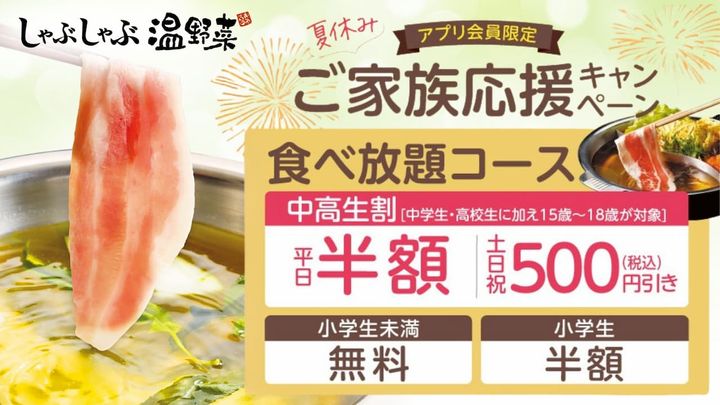 2025年8月8日(金)までの期間、「しゃぶしゃぶ温野菜」では公式アプリ会員限定で「ご家族応援キャンペーン」を実施中! 中高生の食べ放題がなんと平日半額になります。
