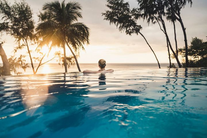 Rear view of woman in infinity pool at sunset, Nai Thon Beach, Phuket, Thailand