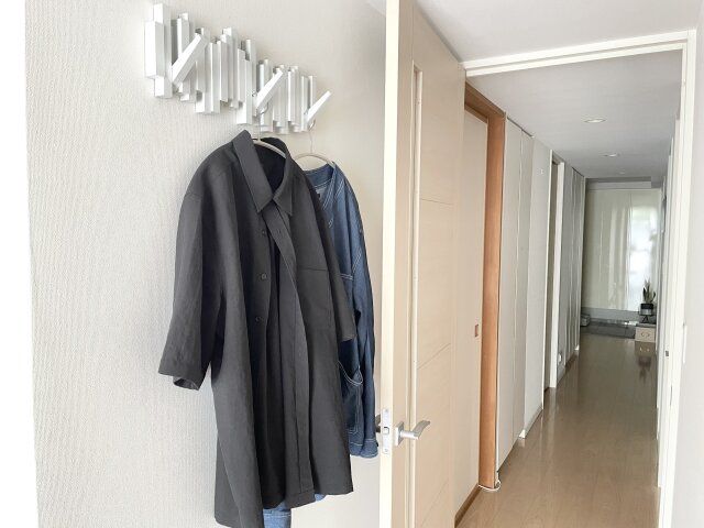 筆者宅では、家族全員が必ずとおる「リビングの入り口」にフックを設置して、脱いだまま放置しがちな上着や、洗濯済みの衣類などを掛けておくようにしています。