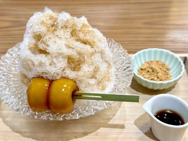 ころんと丸いみたらし団子がのったかき氷に、別添えで黒蜜と深煎りされた黒須きな粉がついてきます。黒蜜をかけても形が崩れないほど氷がしっかりしていて、一般的なかき氷との違いが際立ちます。