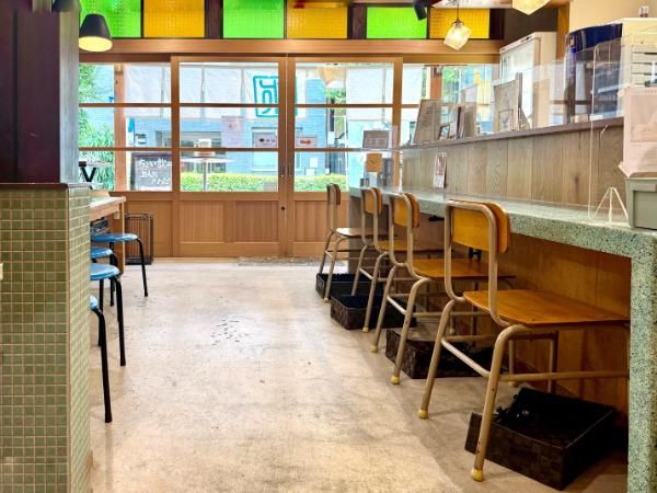 扉を開けると、店内には木製のテーブルや懐かしい椅子が並び、さらにレトロな空間が広がっています。窓の外には緑がたっぷりで、まるで昭和にタイムスリップしたかのような気分に。