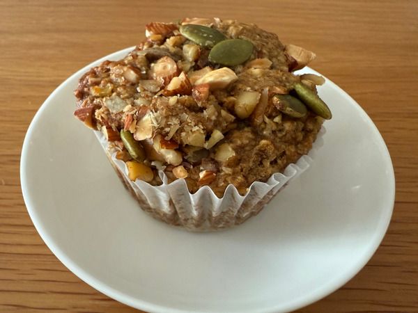 バナナピーナツバター豆腐マフィンは、しっとりしてバナナの自然な甘みが感じられる一品。上にザクザク食感のナッツ類がトッピングされています。