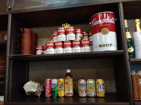 沖縄の家庭料理の定番食材のキャンベルスープ、ソフトドリンクとアルコール類