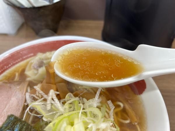生姜が効いた手作りを感じられるワンタンでした。割りばしでつかもうとしてもチュルンチュルンで崩れるので、レンゲですくっていただきました。