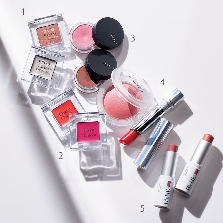 1:<上>ミネラルマルチパウダー トープピンク ¥2,530<下>ミネラルアイバーム シルバージュエル ¥2,750※8/6限定発売(ともにエトヴォス)2:マルチカラーバリエーション<左から>GL08、GL02 各¥1,320(チャコット)3:オサジ ニュアンス フェイスカラー<上から>03、01 各¥3,190(OSAJI)4:<上>グロー プレイ クッショニー ブラッシュ チアー アップ ¥4,950<下>グロー プレイ テンダー トーク リップ バーム 460 ¥3,960(ともにM・A・C)5:バイユア セラムフィット ボリューミング グロースティック<左から>03、01 各¥2,090(Hamee)