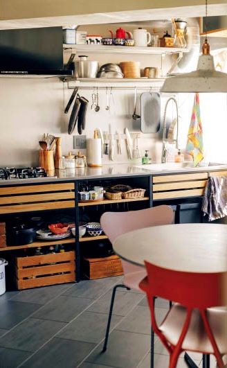 キッチンの対面がミニマムなダイニング。この感覚が海外ライク。物の出し入れがしやすいオープン棚は、器の色や模様がアクセントになっている。