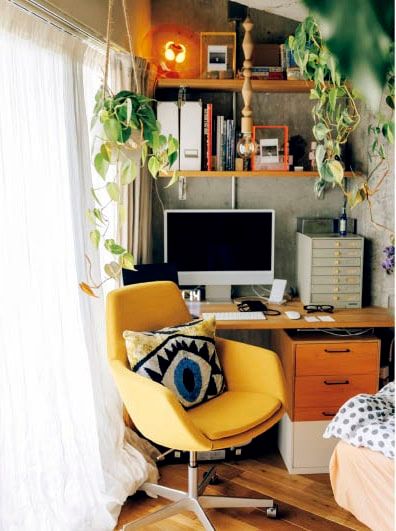 「在宅メインだから明るい場所で仕事がしたい」と、光がたっぷりと差し込む窓際にワークスペースを確保。変則的な一角に棚と机を取り付け、おこもり感を演出。
