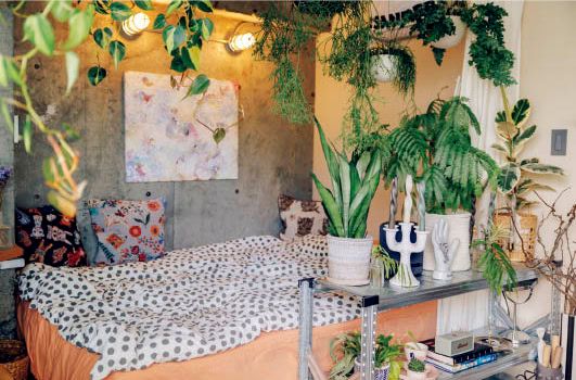 ラックや天井から吊るしたグリーンで、就寝スペースをほどよく区切って。打ちっぱなしの壁にリネンの柄や自作の絵が映える。アート感を強めることで、生活感を出さない工夫を。
