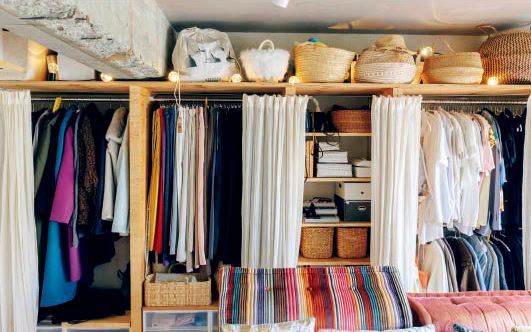 リビングの壁一辺をクローゼットにした、圧巻の造作収納。部屋が散らからない、目隠しのカーテンは湿気がこもりにくい、とよいことずくめ。リネン類は上部のカゴにIN。モロッカンなカゴがソファのテイストとリンク。