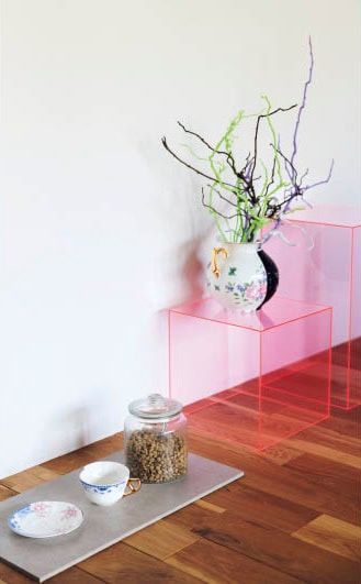 愛犬用の器と奥の花瓶はセレッティのもの。アクリルBOXはウェブでオーダー。カラフルな枝は自作。ペットコーナーがギャラリーのように洗練された空間に!