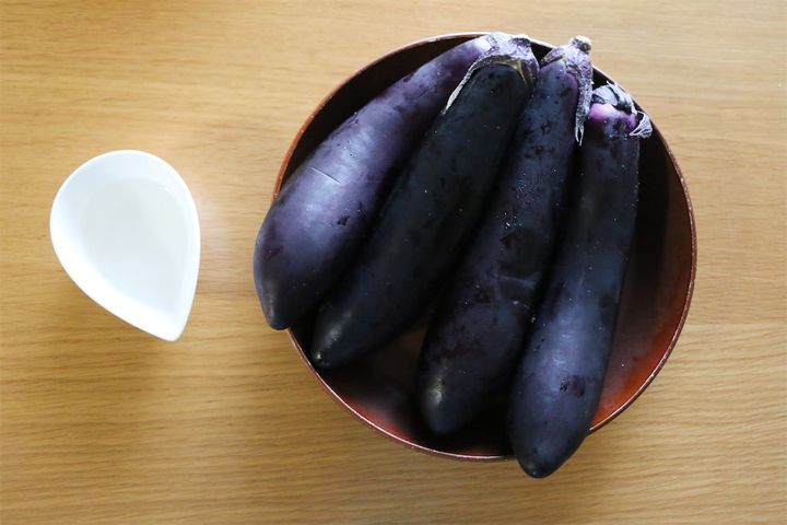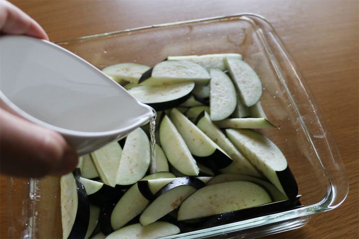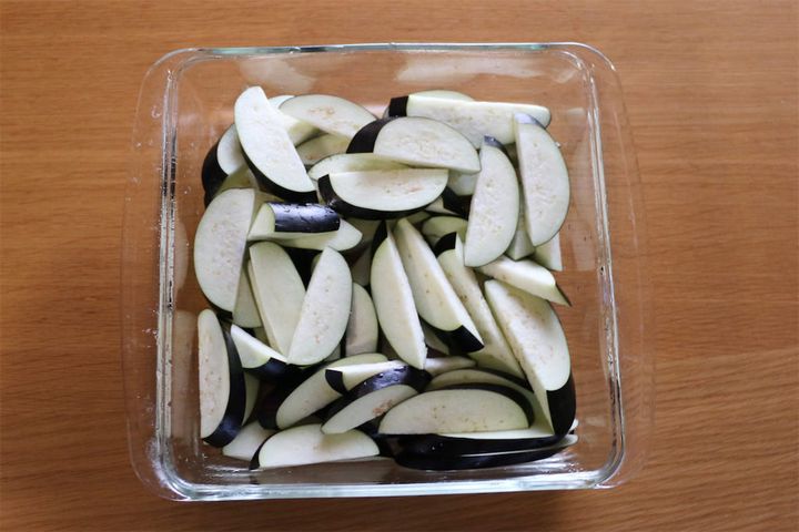 3. 2のなすを耐熱容器に入れ、料理酒を振りかけ、ラップをして電子レンジ500Wで5分ほど加熱し、ラップを外して冷ましておく。