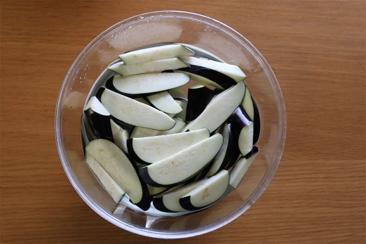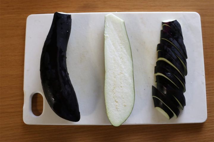 1.なすはヘタを取り、縦半分に切って、さらに1.5cm幅の斜め切りする。
