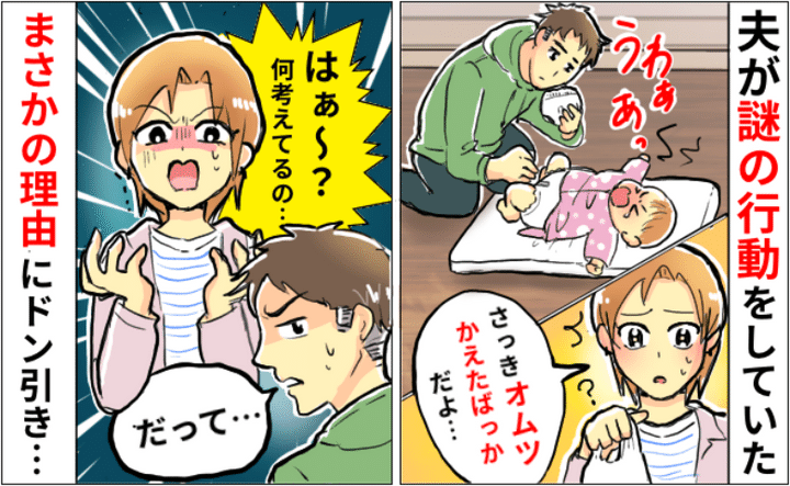 娘のオムツを替えたあと、夫に娘を任せて近所のコンビニへ出かけたのですが、夫はなぜかさっき替えたばかりのオムツをまた替えようとしていました。理由を聞いてみると、まさかの返答が……。