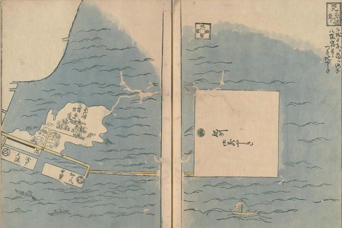 ※左が当時の地図に記載された、海に浮かぶ永代嶋八幡宮。