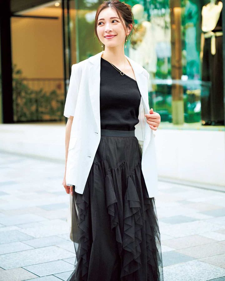 カットソー¥8,800(セブンドット)ジャケット¥23,100(マイストラーダ)スカート¥24,200(アルページュストーリー)バッグ¥72,900(カフネ/カフネ カスタマーサポートセンター)イヤリング¥9,900(イットアトリエ/フォーティーン ショールーム)ネックレス¥143,000(ウノアエレ/ウノアエレ ジャパン)