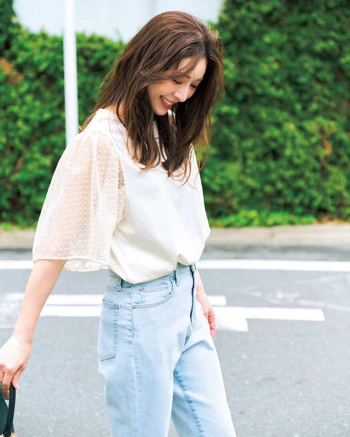 【写真1枚目】ブラウス¥16,940(トラッツォドンナ)パンツ¥7,990(アンフィーロ/アンフィーロ〈オンワード樫山〉)バッグ¥107,100(カフネ/カフネ カスタマーサポートセンター)シューズ¥17,050(ダイアナ/ダイアナ 銀座本店)ピアス¥11,000(YArKA /ロードス)バングル¥82,500(エンド カスタム ジュエラーズ×ハイク/ボウルズ)