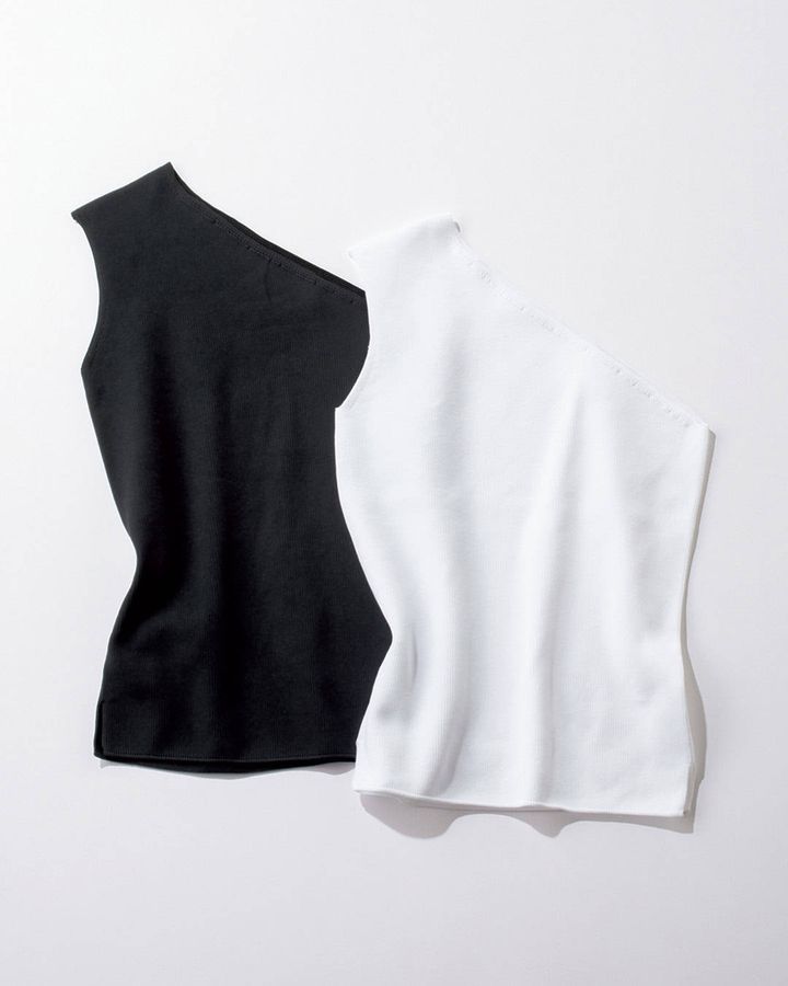 ワンショルダーの直線が美しいトップスはジャケットやシアーアイテムを重ねるインナー使いがおすすめ。ポリエステルのニットで編み込まれサラリとした着心地。