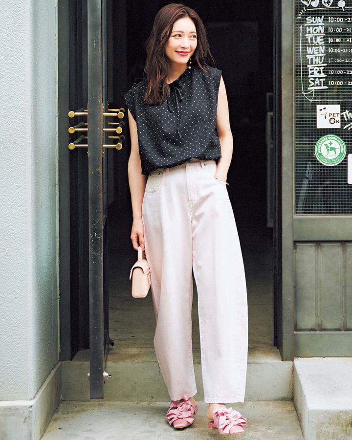 ブラウス¥4,980(ベベッド)パンツ¥20,900(アルページュストーリー)バッグ¥72,900(カフネ/カフネ カスタマーサポートセンター)シューズ¥26,400(ツル バイ マリコオイカワ)バングル¥6,330(エイチアッシュ/フォーティーン ショールーム)