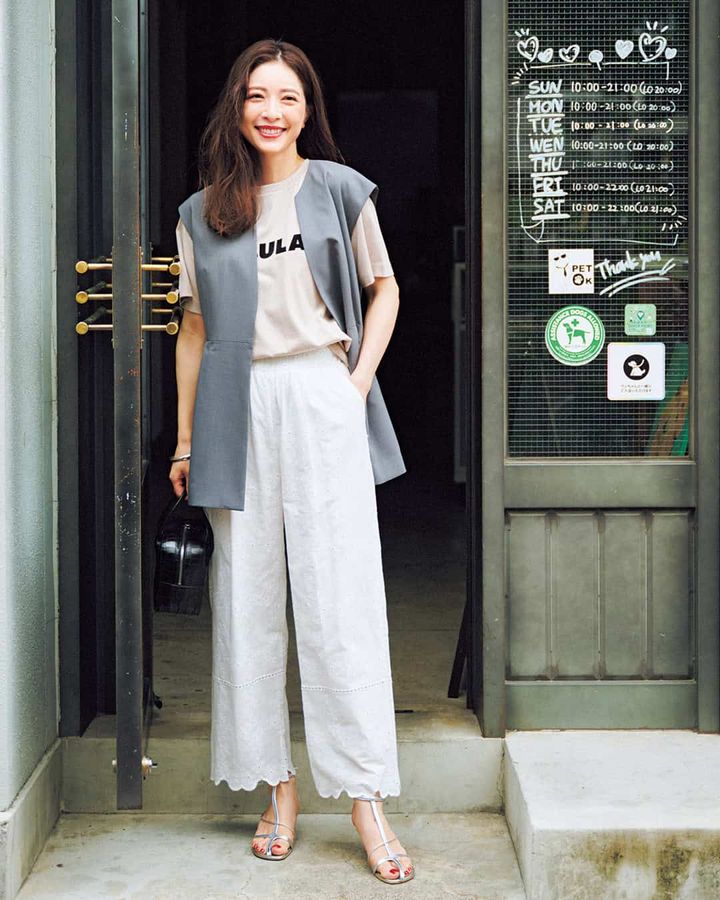 パンツ¥4,980(ベベッド)ジレ¥19,910(ハッシュニュアンス)Tシャツ¥13,200(カデュネ)バッグ¥82,500(メゾン カナウ/ヤマニ)シューズ¥17,050(ダイアナ/ダイアナ 銀座本店)ブレスレット¥37,400(ニナ・エ・ジュール/ショールーム ロイト)