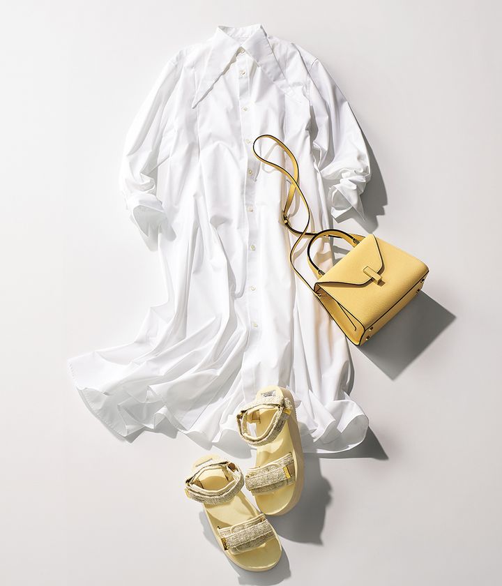 白はもちろん、ネイビーと合わせても可愛い。あと、カーキやブラウンとの相性も◎。サンダル¥49,500(スイコック フォー ドゥロワー/ドゥロワー)ワンピース¥30,000(シーニュ)バッグ¥594,000(ヴァレクストラ/ヴァレクストラ ジャパン)