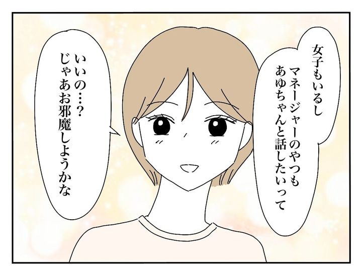 赤ちゃん連れの件でモヤモヤが残る中、まさとから「結婚式の前に、仲良かった奴らで飲み行こうって話してるんだけど、あゆちゃんもどう?今まで紹介する機会なかったしさ、マネージャーのやつも、あゆちゃんと話したいって」と誘われました。