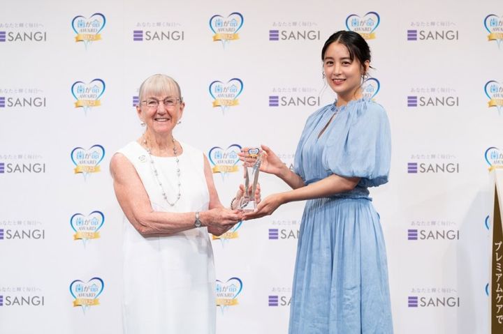 高岡さんから発表された今年の『サンギ歯が命アワード2025』受賞者は、山本美月さん! サンギ代表取締役社長 ロズリン・ヘイマンさんから語られた選定理由は、サンギの今年のテーマである“自然体の美しさ”にピッタリだったとのこと。内面的な美しさが非常に重要とし、山本さんの歯はもちろん、生き方まで非常に考えられて、 非常に透明感のある、ピュアな美しさが素晴らしいと絶賛。