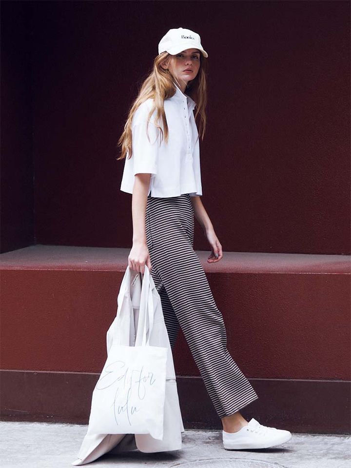 遠目から見ると一見無地に見えてしまうほど、ピッチを狭めたボーダーパンツ。白とブラウンの品行方正な配色だから、幼く見えがちなボーダーも大人っぽく着地。ストレートパンツ感覚で穿けて、こっそりスタイルよく見せられるセミフレアシルエット。