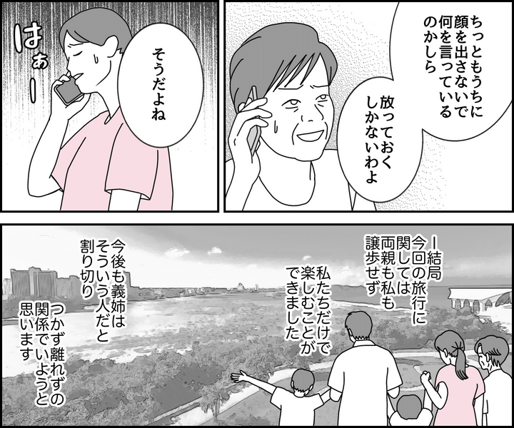 兄も何度も義姉と話しているようですが、進展はないようです。今回の旅行に関しては、両親も私も譲歩するつもりはないので、予定通り進めています。