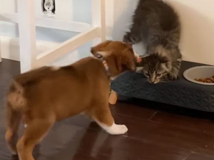「こらこら〜」いたずら子猫さんを叱る子犬さん、まるでお母さんみたい!