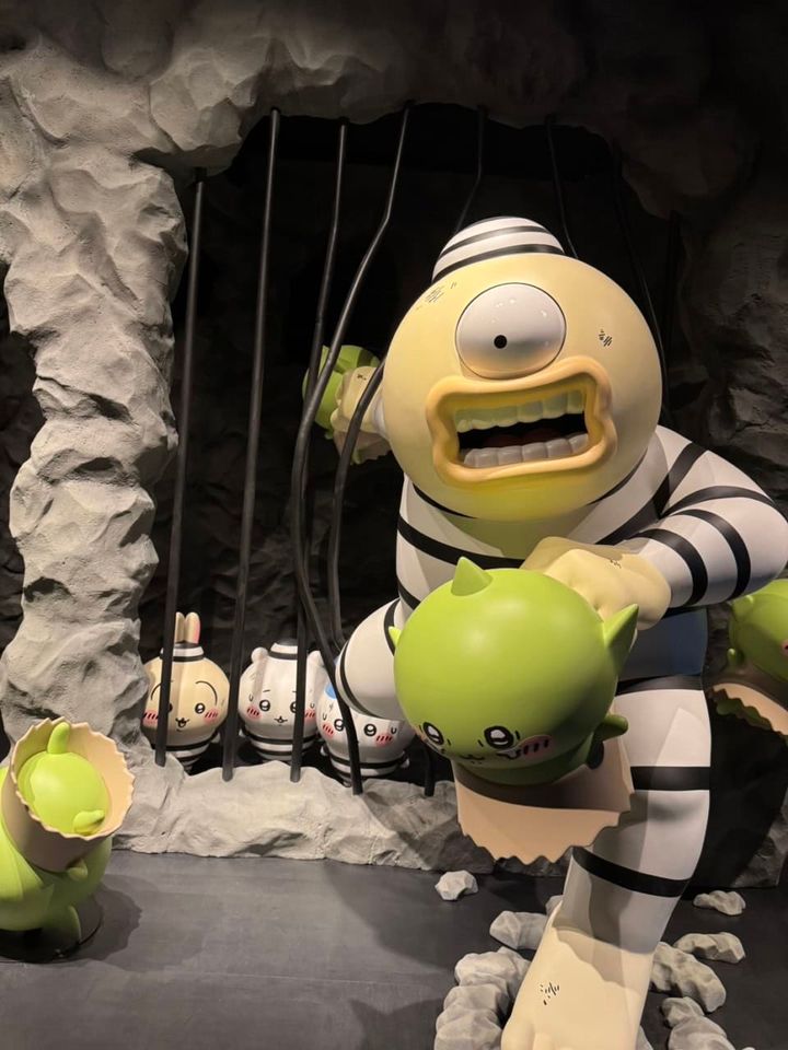 突然巨大なフォトスポットが出現! オデがゴブリンたちの牢屋から脱出するシーンが再現されているこちら。投げ飛ばされそうになっているゴブリンの横を抜けて檻の裏手にまわれば、ちいかわたちと迫力のある写真が撮れちゃいます。