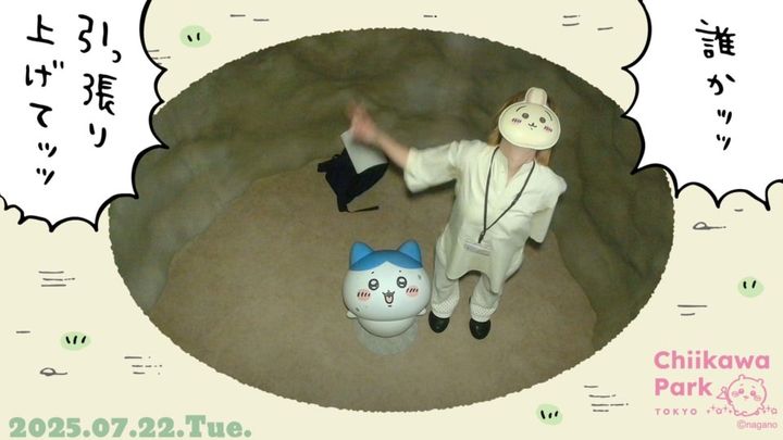 お次は穴に落ちたハチワレと撮影できるスポットへ。このシーン、アニメでも見たことがあり、大興奮! ちいかわが助けに来てくれて感動するんですよね~。