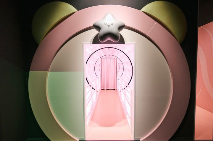入口を潜り抜けると、ちいかわパークオリジナルのウェルカムムービーが映し出されるウェルカムシアターがあり、そこから展示エリアへ進む道に目覚まし回廊なるものが。黒い流れ星が生み出したループ空間は、なめてかかると目がまわる~!