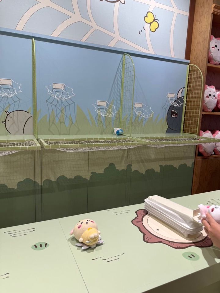 ショップエリアの横には有料のゲームエリアも。「ミートボールころがし」「くものすキャッチャー」の2種類です。一体どんなゲームよ!? となりましたが、ここで予想以上のハッスル! どちらか1種類を700円で3回挑戦できるという形なのですが、景品も豪華。失敗しても可愛いチャームがもらえるので、ぜひトライしてみてください。