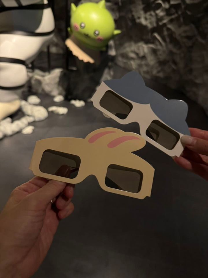 3Dシアターでは専用メガネを掛けて楽しみます。ちいかわたちの目線で討伐対象たちの恐ろしさが体験できるというわけ。シュール! ちなみにランダムでもらえるこちらのメガネはお持ち帰りOKだそう。