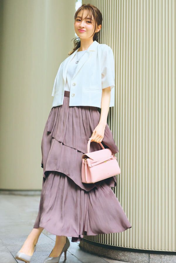 暑い時季が長くなった影響で、リネン見えする涼感素材ジャケットや半袖ジャケットが豊作! ジャケット代わりに、きちんと見えするカラー&デザインのカーデを取り入れるのもアリです。ジャケットが今っぽいショート丈なので、レディライクなフレアスカートともバランスが取りやすく使い勝手上々。見た目も涼しげな白を♡