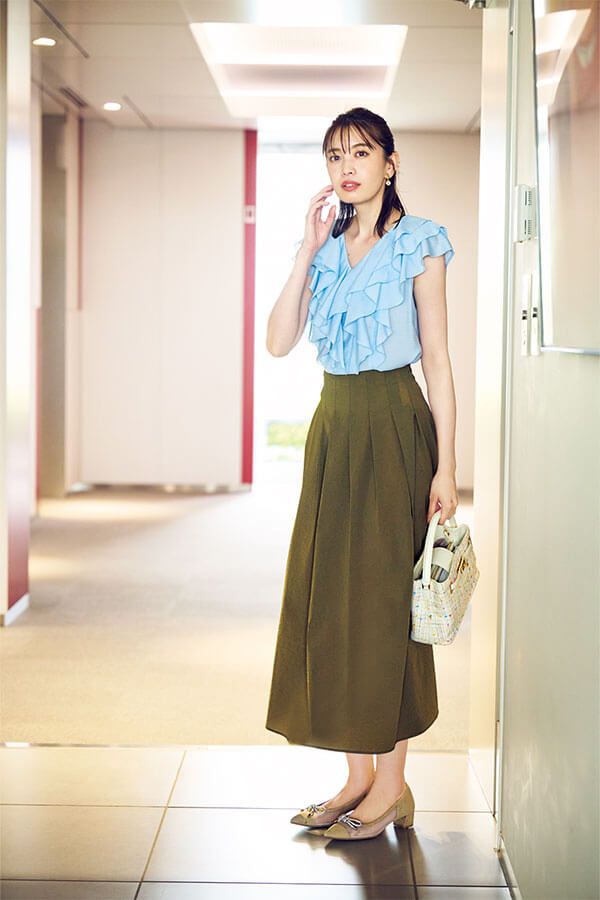 ラッフルフリルのリズム感で清楚な水色のおしゃれさがUP! 落ち着きのあるカーキスカートで、甘トップスとのバランスもしっかりと図って。