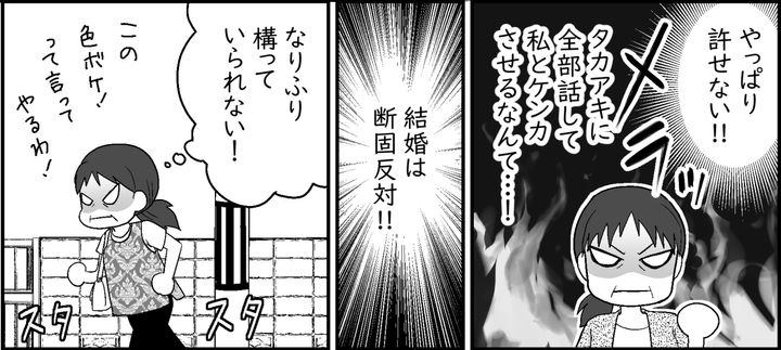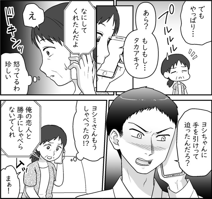 自分から身を引いてほしいとヨシミさんに伝えた私。しかし彼女はそのやりとりをすぐにタカアキに伝えたのでしょう。電話をかけてきたタカアキは珍しく怒っています。思いがけず責められ、私もついムッとして言い返します。